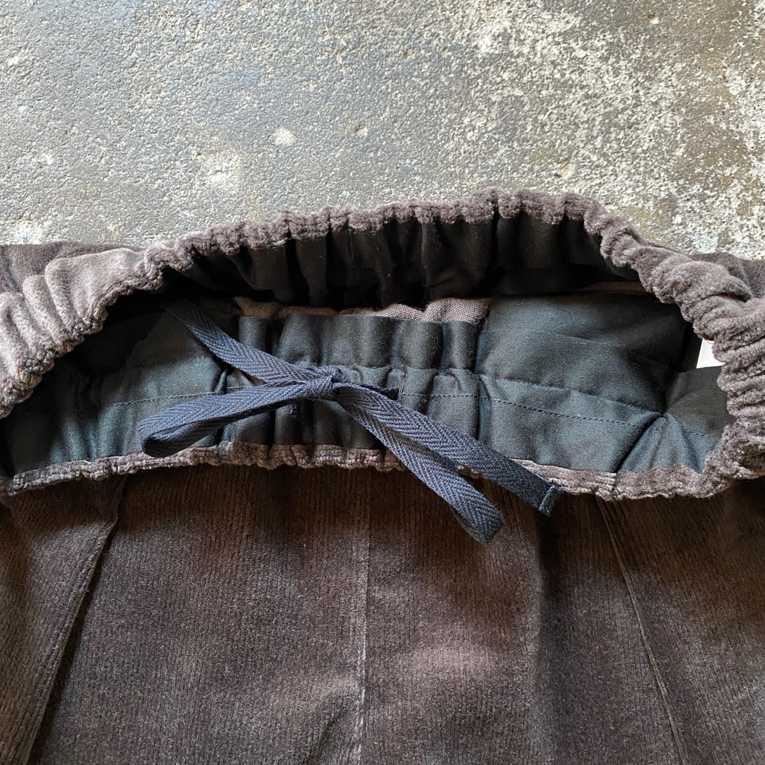 ウエスト部分には内側にぐるりと一周ゴムが仕込まれており、更にヘリンボーン織りのドローコードが付くイージーパンツ仕様となっております。