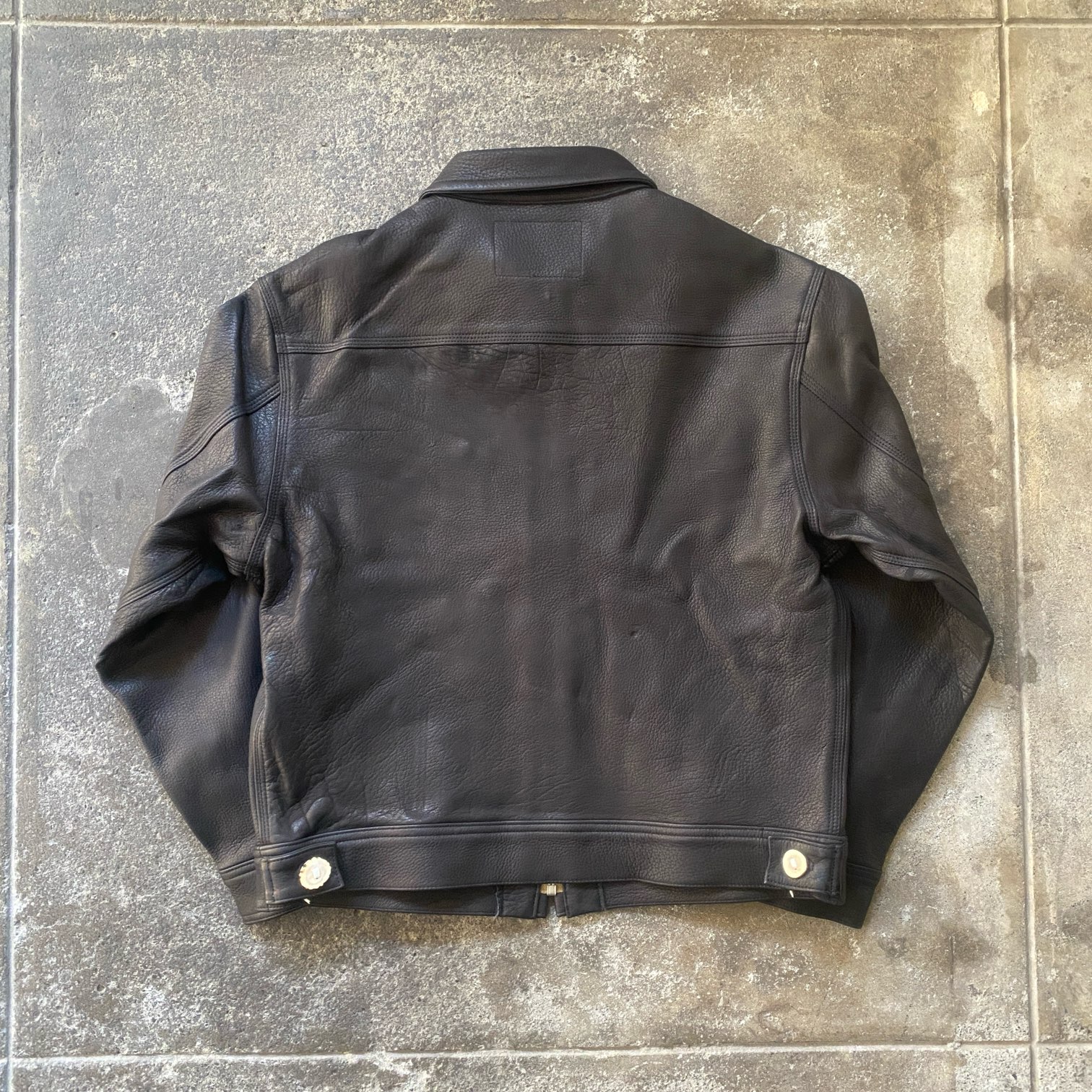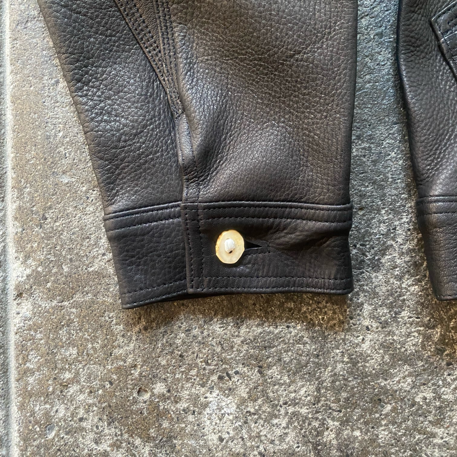 非常にしっかりとした厚みのあるエルクスキンをボディ全体に使用し、ボタンにはBOW&ARROW遠藤氏自らが鹿角を数年間かけ て集め、手作業でカットし、研磨、穴あけ、クリア 塗装、そして鹿革紐を製作し、手作業で取り付けと途方もない情熱と労力をかけた鹿角ボタンが使用されております。