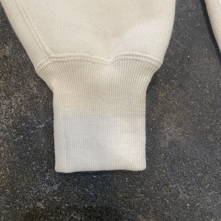 袖リブ、裾リブも着初めはややタイトに感じるフィット感ですが着込み、洗濯を繰り返した”後”を計算してのしっかりと身体に沿うディティールです。