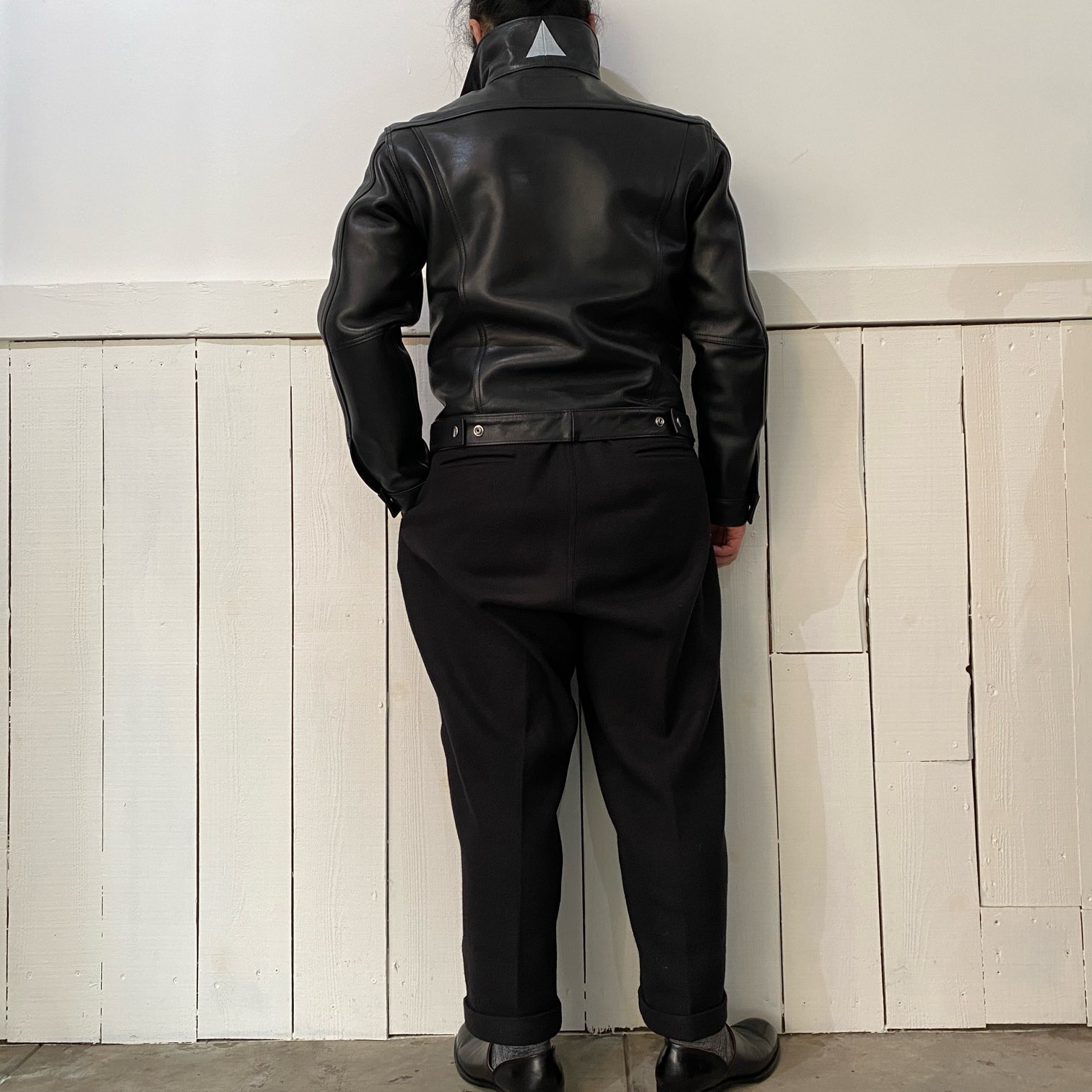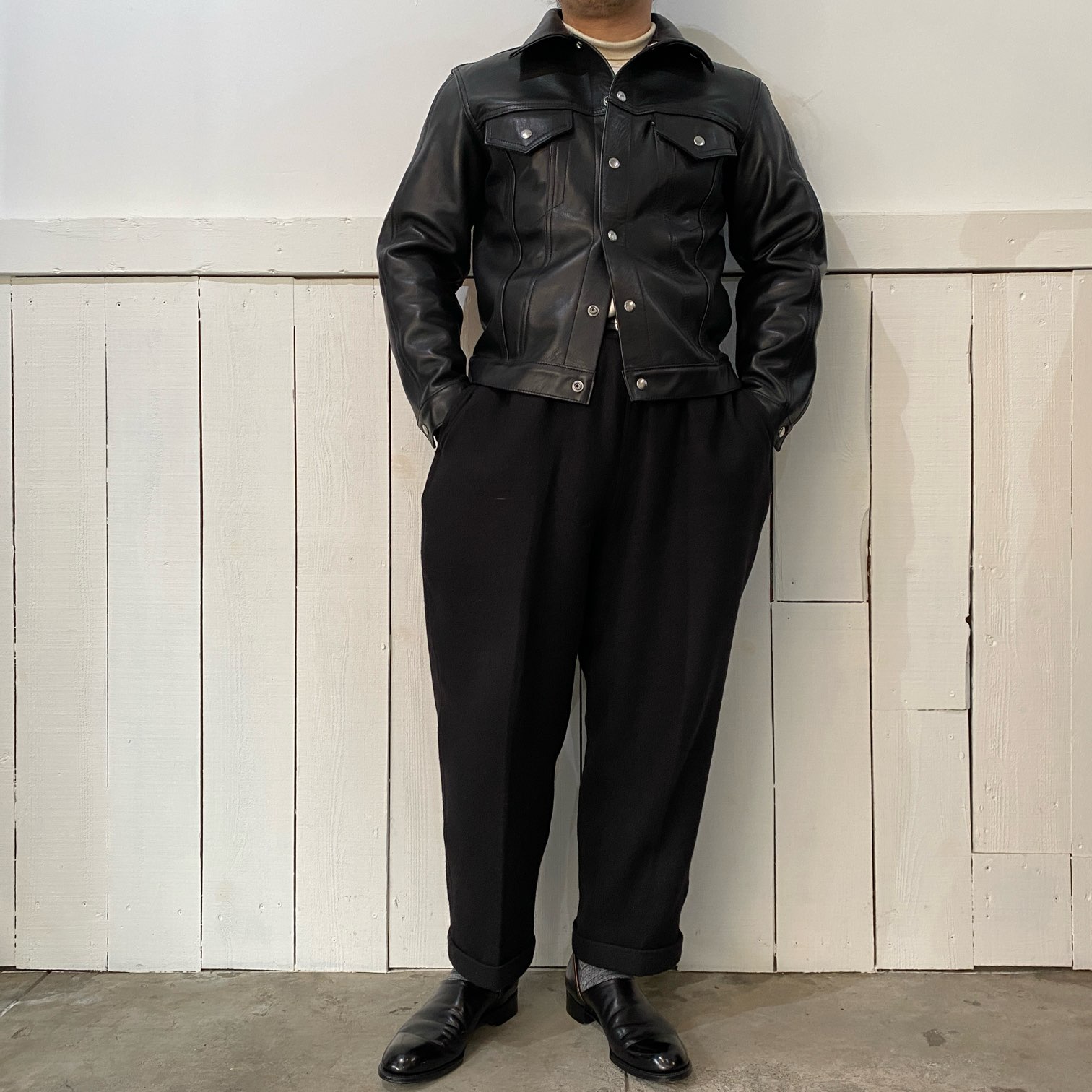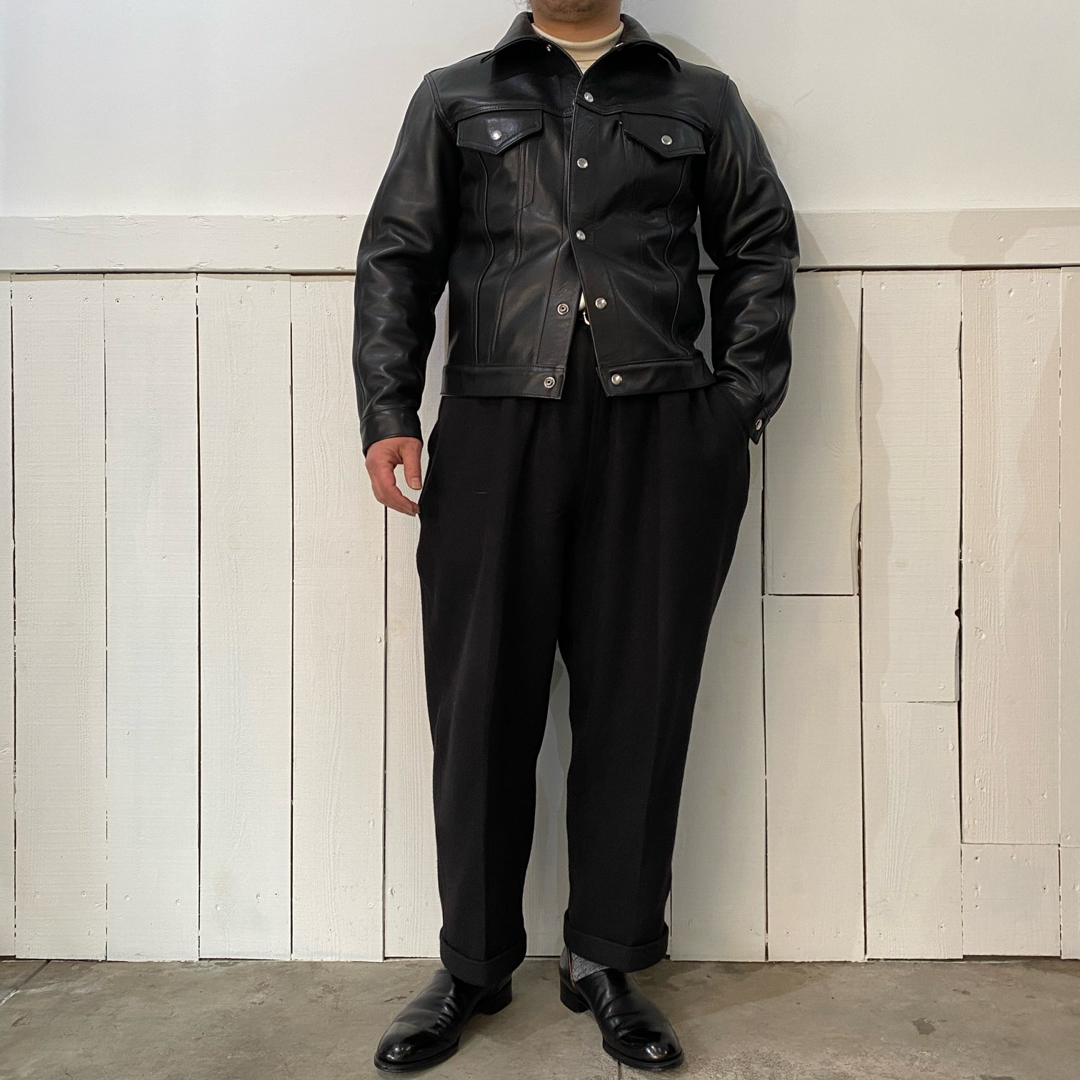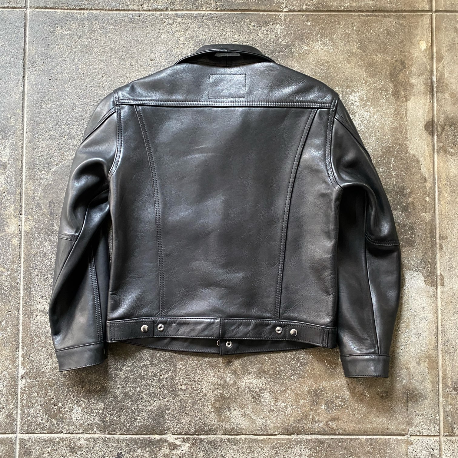 新品の状態ですと張りのあるレザーの質感ですが、着込むほどに馴染む過程をぜひ楽しんで頂きたい・・・そんな一着となります。