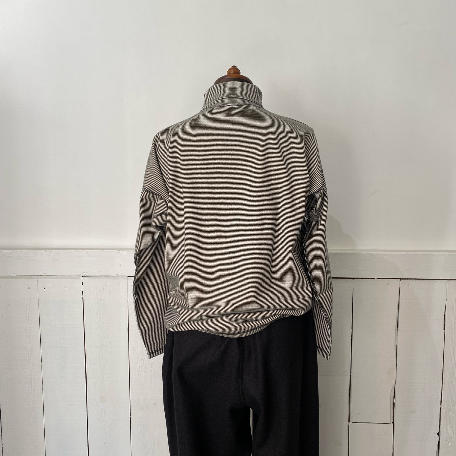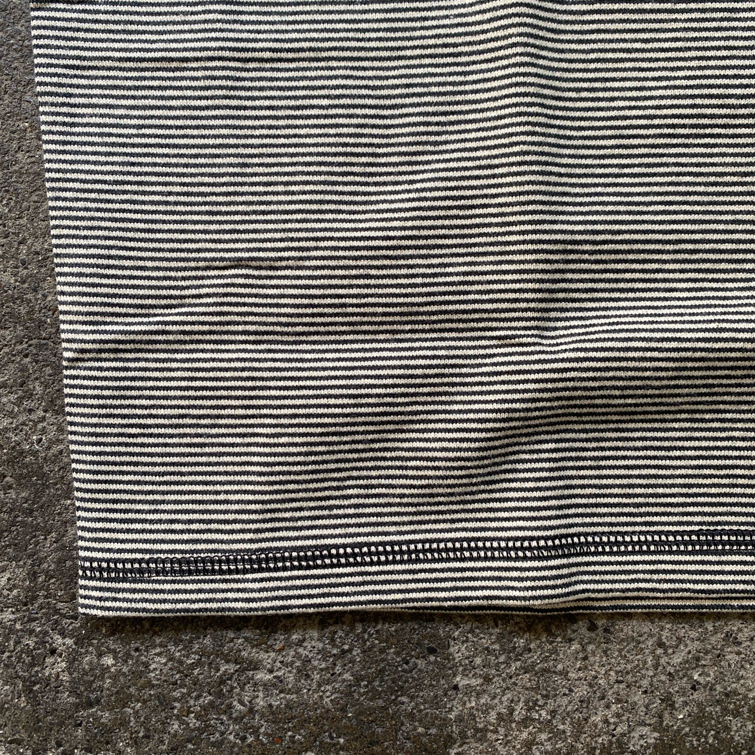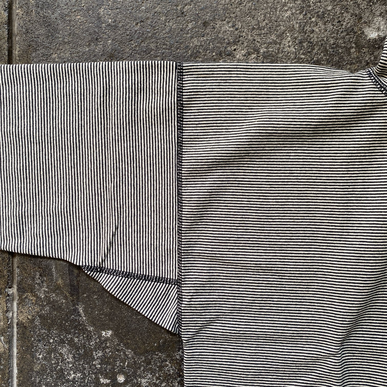 細ピッチのボーダーパターンで生地自体に凹凸感が感じられ、全体的にはほぼグレーカラーのように見えますが、良く見ると細いボーダーという大人の方には特に相性の良さそうな落ち着いた生地感とカラーかと思います。