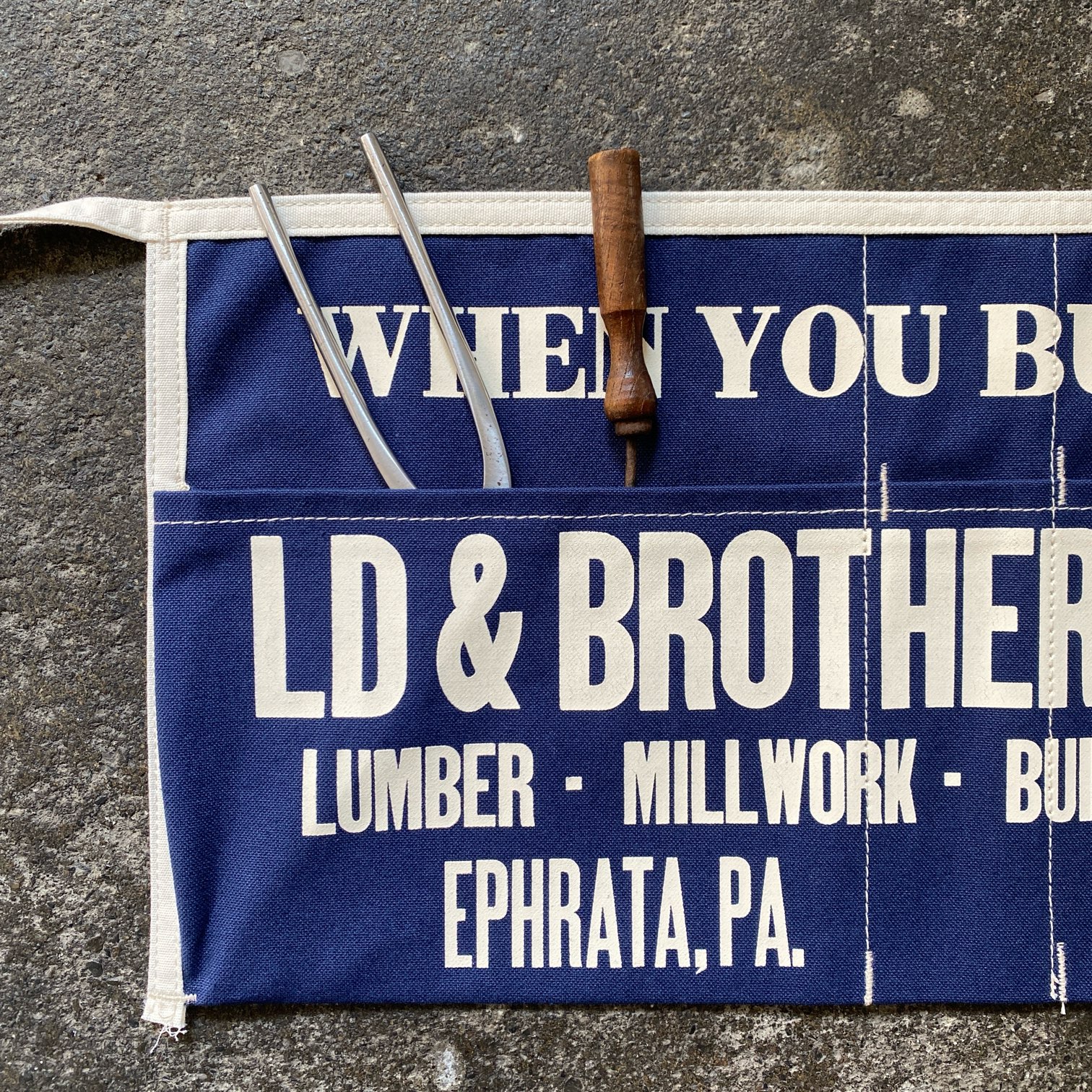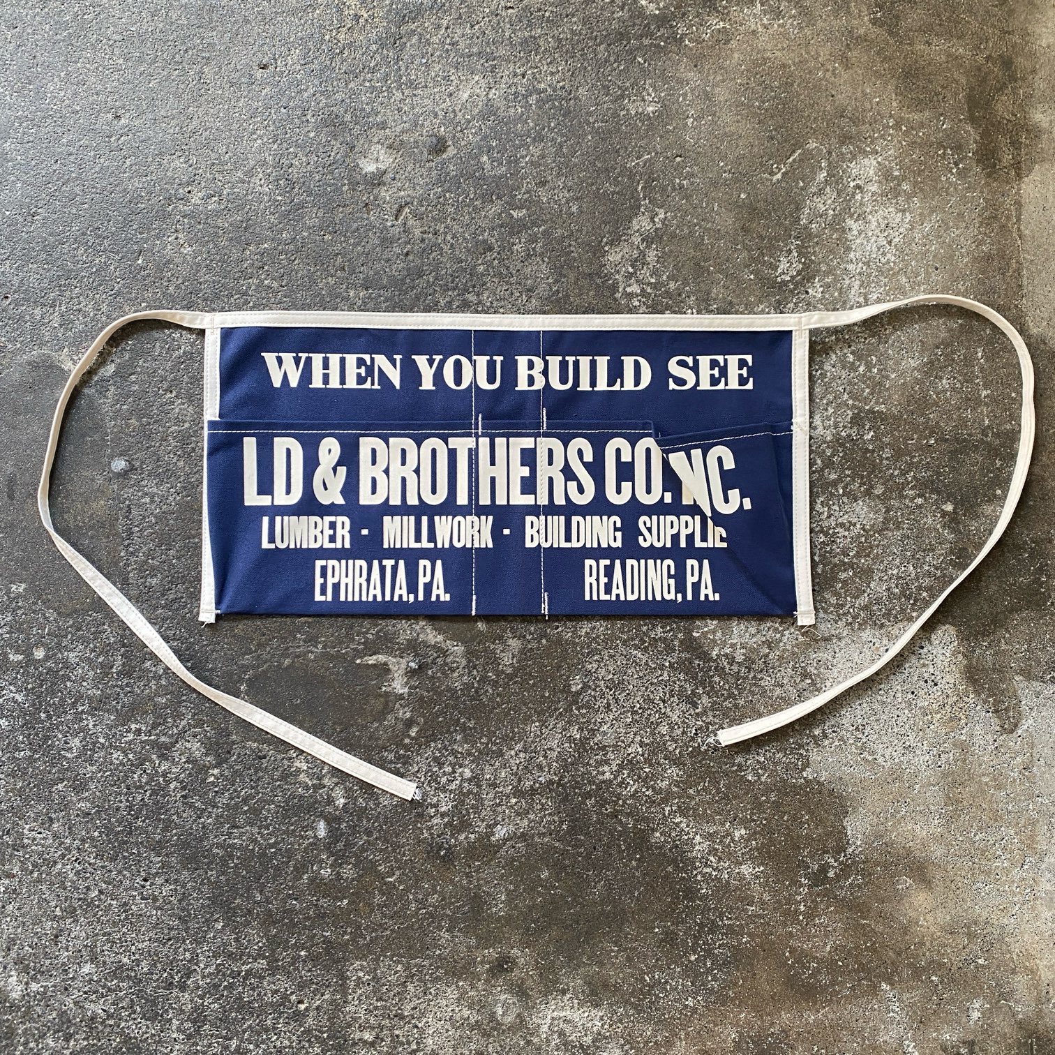 ネイルエプロンとは、本来は大工や建築現場で釘(ネイル)やビスなどの小さな資材を持ち運ぶための作業用エプロン。腰回りのポケットに釘や工具を入れて作業する、アメリカのカーペンターには馴染み深いワークアイテムの一つです。
