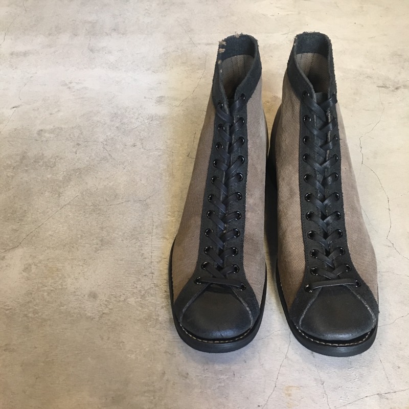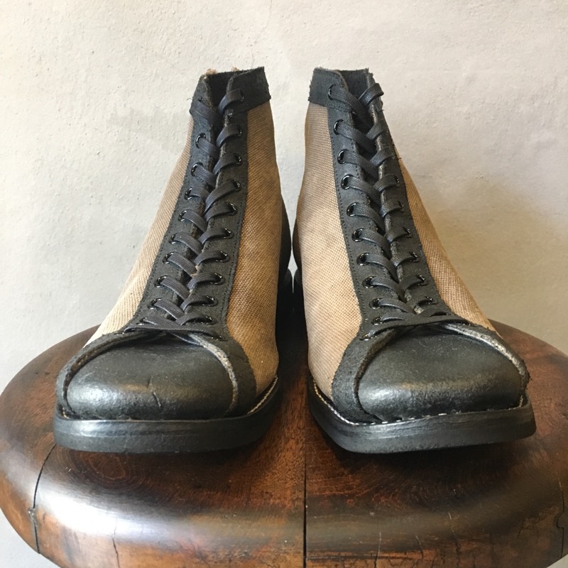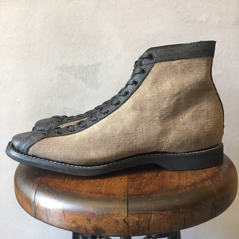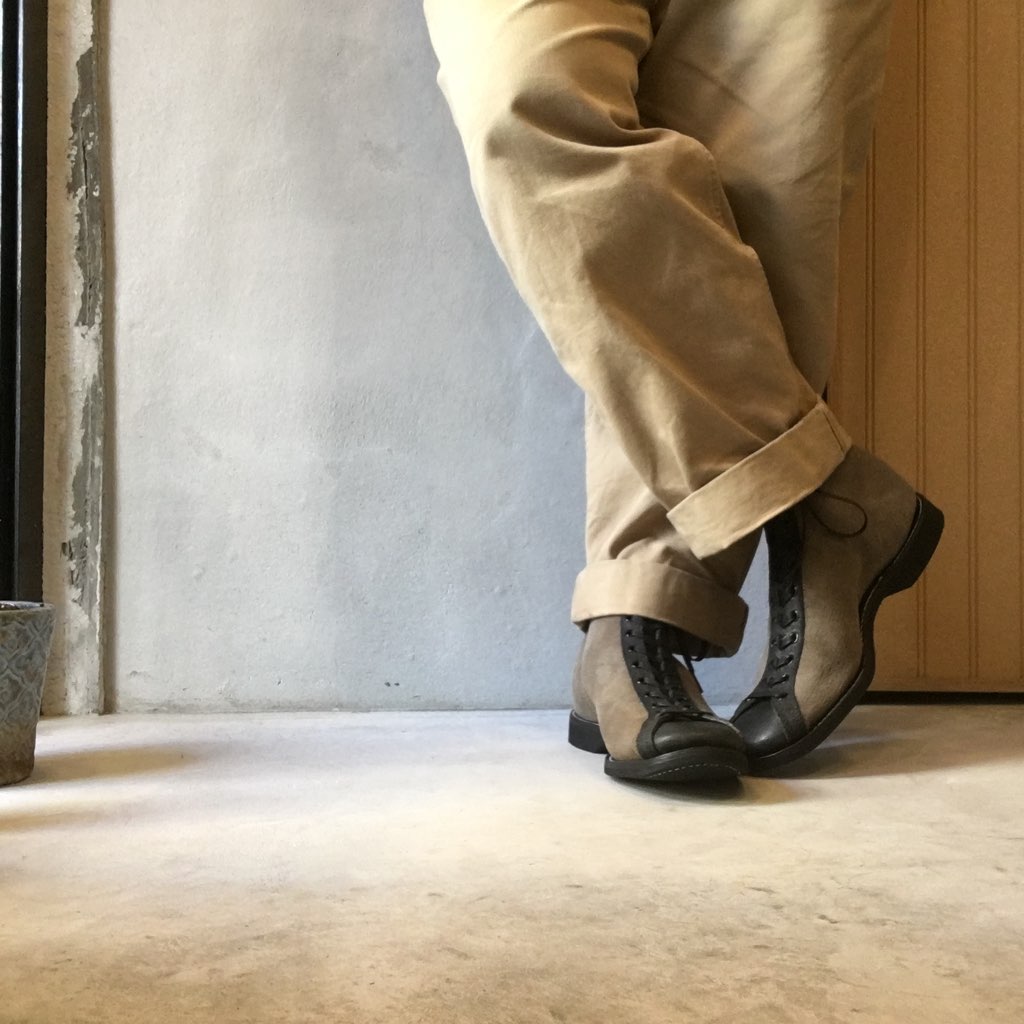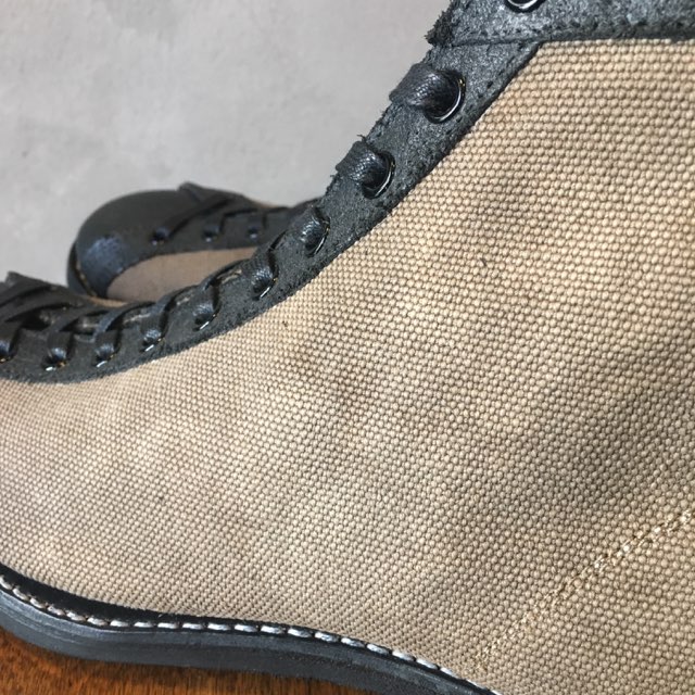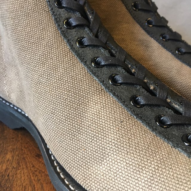 生地は1940年代のUS.MILITARYファブリックを採用し、つま先のレザー部分や履き口のレザーにはクロムエクセルのブラックラフアウトを使用し、更にラフアウトを寝かせる加工を加え、この靴独特な仕様に仕上げていただきました。